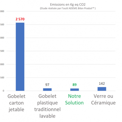 Sur une durée de vie minimale de notre verre (estimé à 2 ans mini) on arrive à un impact CO2 de nos verres 58 fois inférieur au jetable.