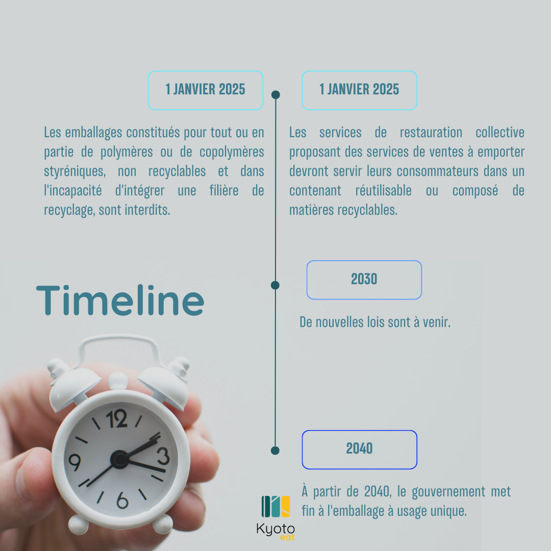 - Janvier 2025, les services de restauration collective proposant des services de ventes à emporter devront servir leurs clients dans un contenant réutilisable ou composé de matières recyclables.